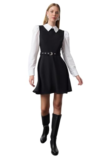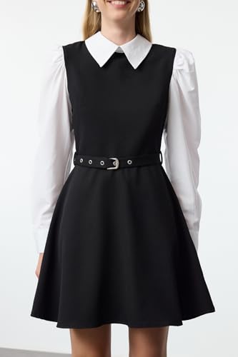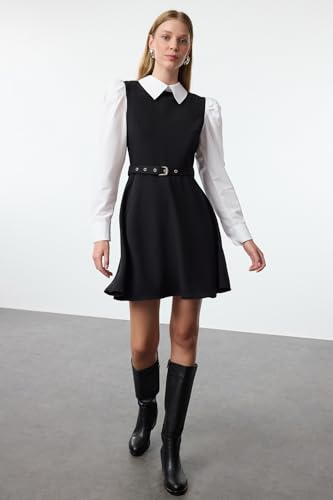 Trendyol - فستان قصير للنساء منسوج بحزام وفتحة عند الخصر من ترنديول، لون أسود، TWOAW25EL00398