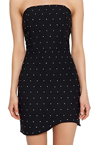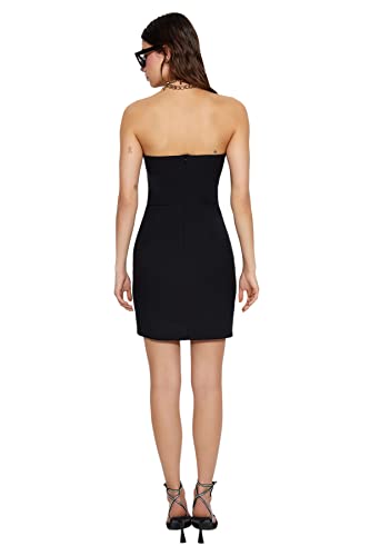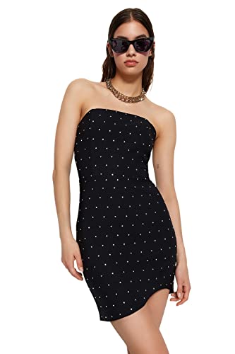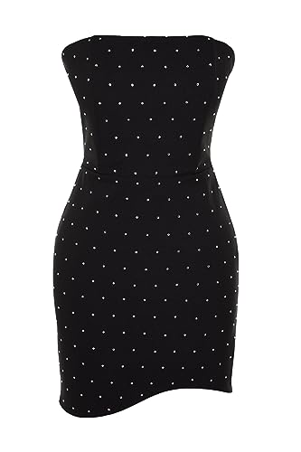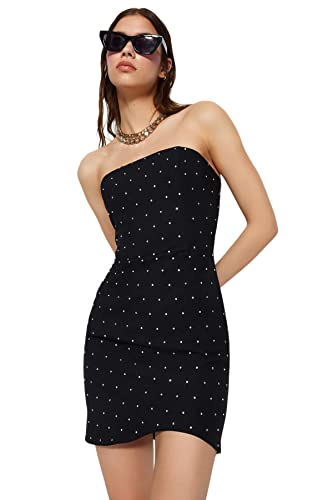 Trendyol - فستان سهرة قصير أنيق منسوج بدون حمالات للنساء من ترينديول، لون أسود مطبوع عليه تصميم لقطع حجر دقيقة، (عبوة من قطعة واحدة)، موديل TPRSS23EL00577