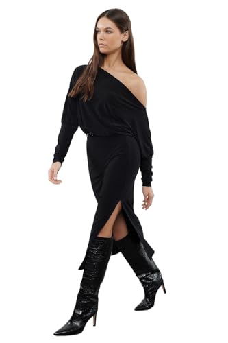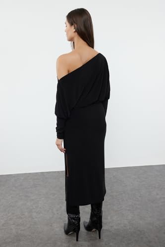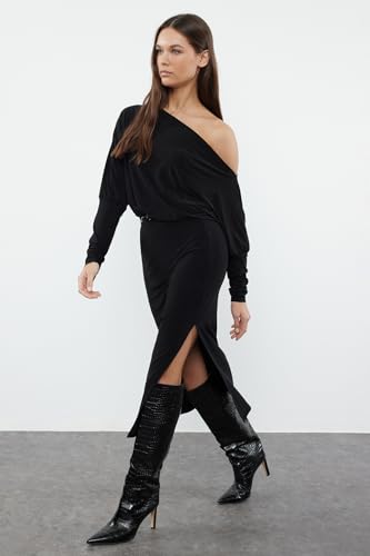 Trendyol - فستان محبوك متوسط الطول وقابل للتمدد بقصة مستقيمة غير متساوية وكم واحد للنساء، بلون أسود، موديل TWOAW25EL00110 من ترنديول