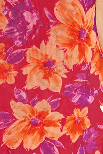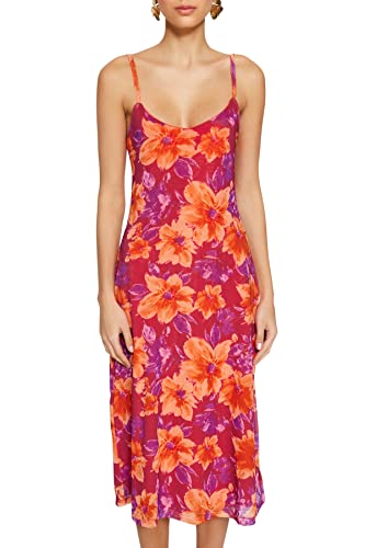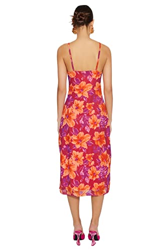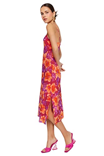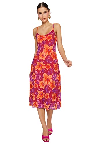 Trendyol - ترنديول فستان متوسط الطول للنساء بنمط زهور بلون بينك مع فتحة واشرطة من التول المبطن TWOSS23EL01453