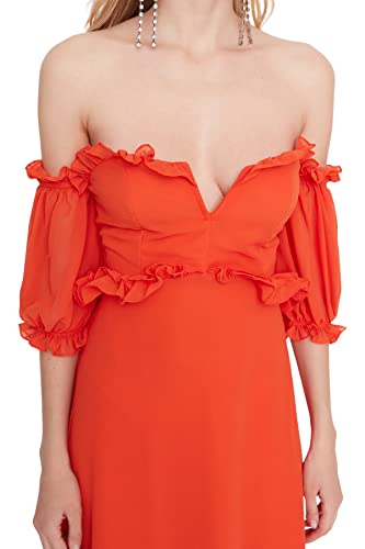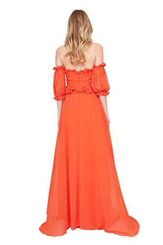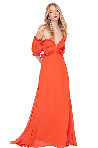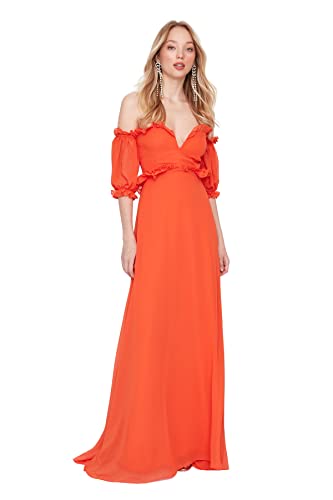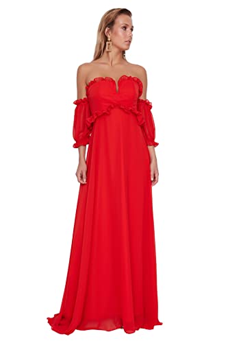 Trendyol - فستان سهرة طويل وأنيق من شيفون نسيج محبوك بتصميم زهرة الرمان بقصة A للنساء موديل TPRSS22AE00047 للسهرات وحفلات التخرج