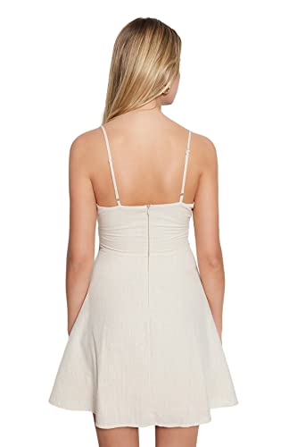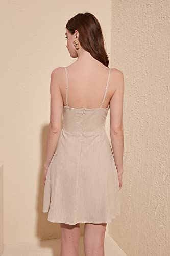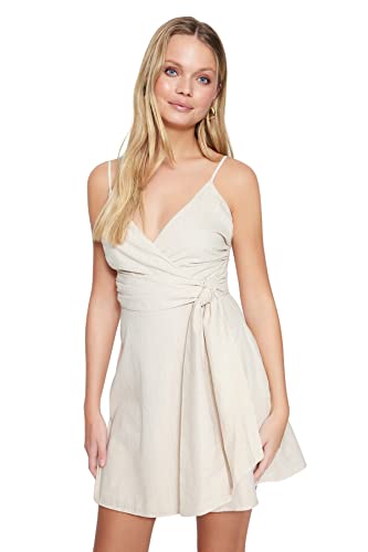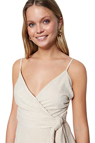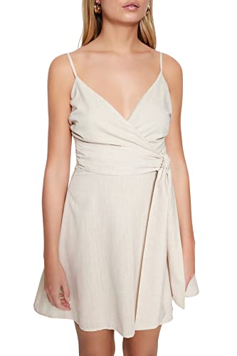 Trendyol - فستان للنساء TWOSS19XN0008 بلون حجري بحزام وقصة ايه لاين قصير بياقة مزدوجة الصدر منسوج بمظهر الكتان من ترينديول