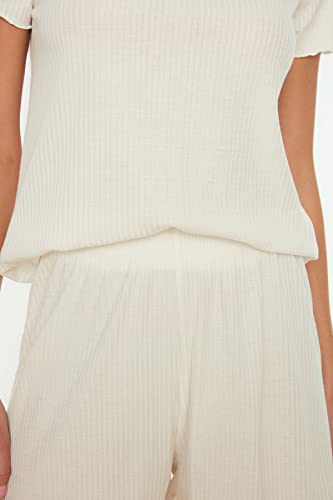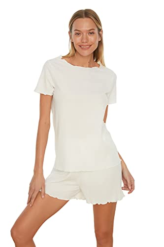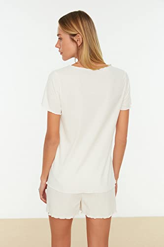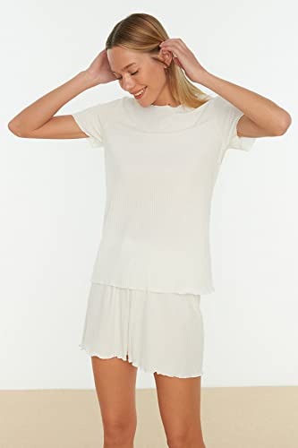 Trendyol - ترنديول طقم بيجامة محبوكة مكون من تي شيرت وشورت من قماش قطيفة مضلع للنساء، موديل THMSS21PT0259