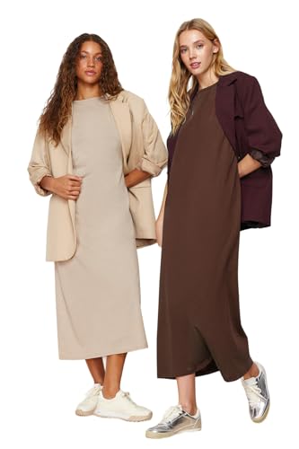 Trendyol - ترنديول فستان محبوك للنساء من القطن بنسبة 100% بلون بني وبيج - TCTAW22UK0110 (عبوة من قطعة واحدة)