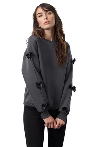 Trendyol - سويت شيرت Twoaw25Sw00249 مع تصميم بتفاصيل فيونكة مقاس كبير/واسع، منسوج ومبطن من الصوف الناعم السميك من الداخل للنساء من ترنديول، لون رمادي (Anthracite)، قطعة واحدة