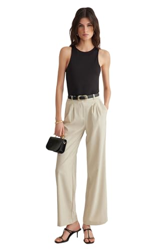 Trendyol - ترنديول بنطلون منسوج بكسرات بارجل واسعة للنساء بلون بيج (عبوة من قطعة واحدة)