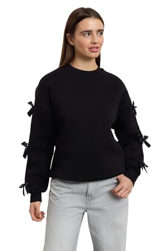 Trendyol - سويت شيرت مع تصميم بتفاصيل فيونكة مقاس كبير/واسع، منسوج ومبطن من الصوف الناعم السميك من الداخل للنساء طراز Twoaw25Sw00249 من ترينديول، لون أسود، 1 قطعة