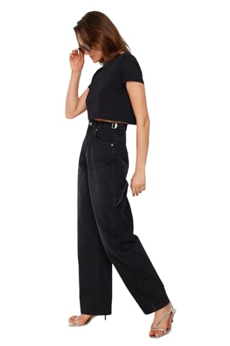 Trendyol - ترنديول بنطلون جينز فضفاض فضفاض بخصر مرتفع للنساء بلون اسود أكثر استدامة Twoaw24Je00308
