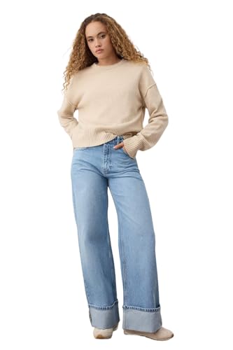 Trendyol - بنطلون جينز للنساء بخصر عادي وأرجل واسعة وطيّة عند الساق Twoaw26Je00011 من ترينديول، أزرق (عبوة من قطعة واحدة)