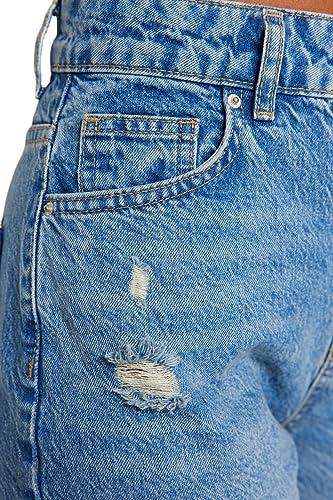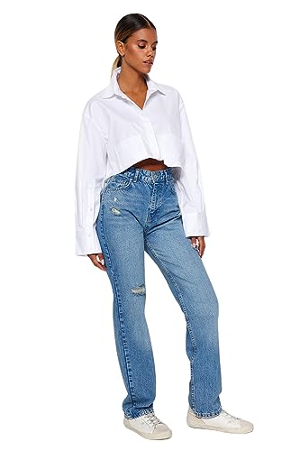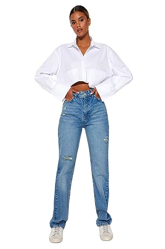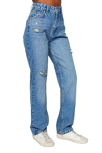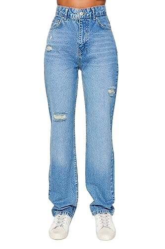 Trendyol - ترنديول بنطلون جينز طويل بقصة مستقيمة وتصميم ممزق بخصر مرتفع للنساء TWOAW24JE00033 (عبوة من قطعة واحدة)