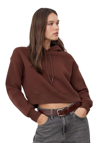 Trendyol - سويت شيرت منسوج بيسيك قصير بقصة مريحة وغطاء للرأس ومنبطن بصوف ناعم سميك TWOAW24SW00105 للنساء من ترينديول، بني (عبوة من قطعة واحدة)
