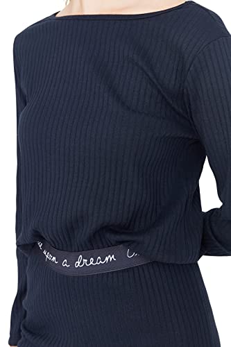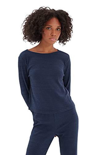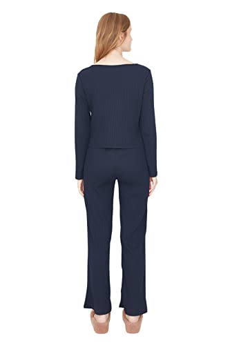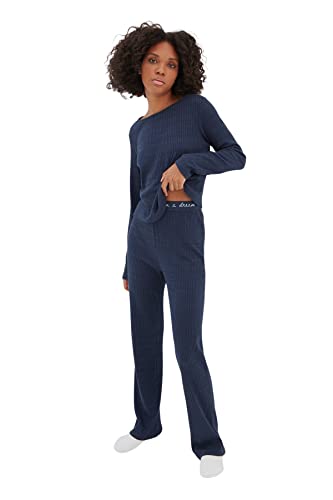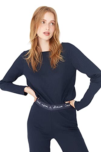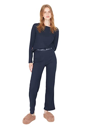 Trendyol - بيجامة Thmaw21Pt0269 منسوجة بقصة مضلعة للنساء، مزينة بشعار وتفاصيل مطاطية من ترينديول، لون أزرق كحلي، (عبوة من قطعة واحدة)