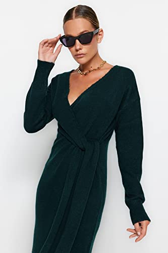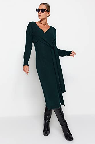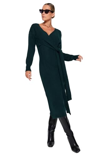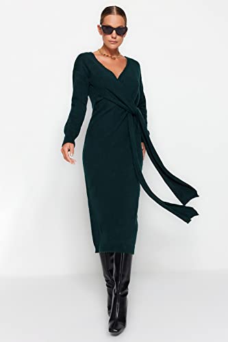 Trendyol - ترنديول فستان تريكو متوسط الطول للنساء بلون اخضر زمردي - نسيج ناعم، ياقة مزدوجة الصدرية، فستان برباط Twoaw21El0260 (عبوة من قطعة واحدة)