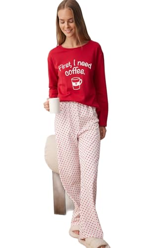 Trendyol - ترنديول طقم بيجامة للنساء من القطن الاحمر مع قلب - طباعة شعار، عصابة راس للنوم Thmaw25Pt00223 (مجموعة من قطعة واحدة)
