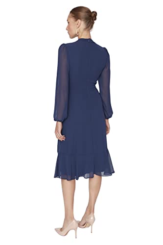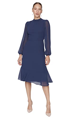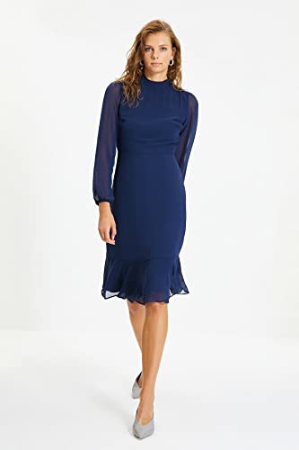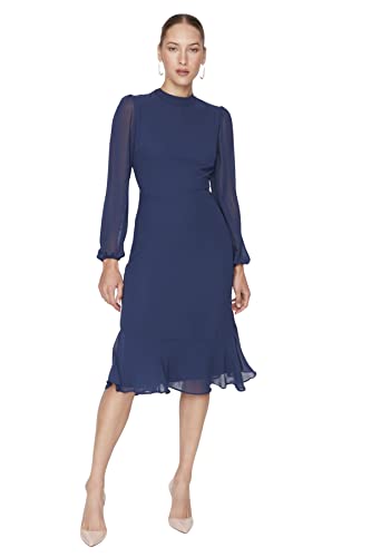 Trendyol - ترنديول فستان ترنديول نسائي متوسط الطول بحافة مكشكشة وياقة واقفة منسوج (عبوة من قطعة واحدة)