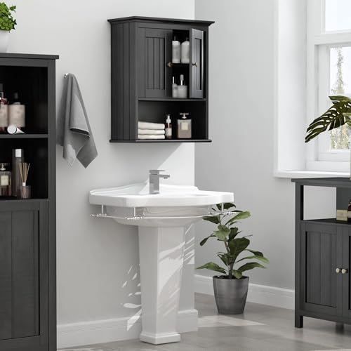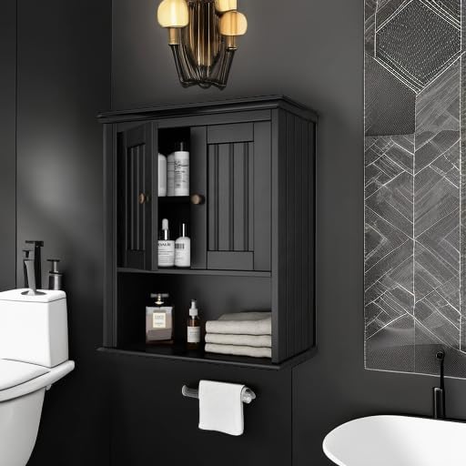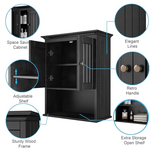 Treocho - دولاب حائط خشبي للحمام مع أبواب ورف قابل للتعديل بحامل يثبت على الحائط من تريشو، لتخزين الدواء بالحمام وغرفة المعيشة والمطبخ وخزانة الطعام، لون أسود، خشب مُصنع