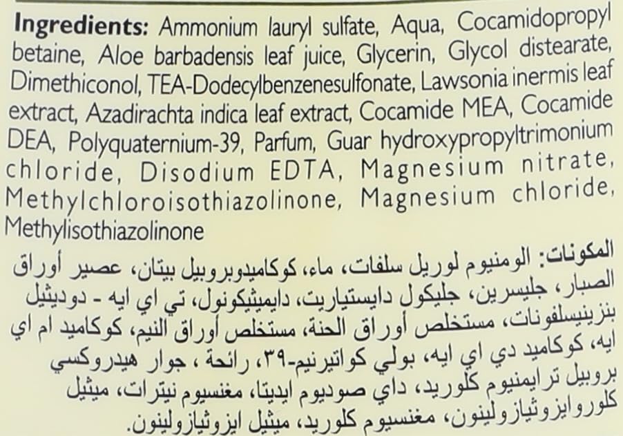 - المكونات الأساسية: مستخلص الصبار، النيم والحنة