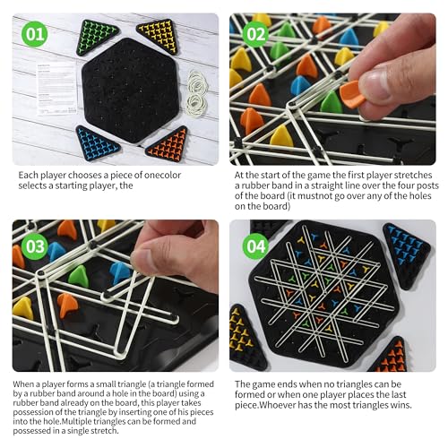 - المواصفات: سوف تحصل على مجموعة واحدة من الألواح المثلثة بما في ذلك: 1 × لوحة قاعدة لوحة الألعاب، 4 × لوحات ألعاب صغيرة، 4 ألوان من قطع الألعاب 84 قطعة، 50 × شريط مطاطي، شطرنج مثلثات متشابكة للعديد من اللاعبين، المزيد من المساعدة على تطوير التفكير المنطقي والتركيز لدى الأطفال!