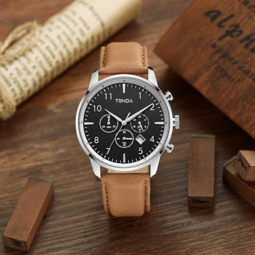 TRNDA - ساعة ستانلس ستيل كلاسيكية بمينا رصاصي للرجال من ترندا - ساعة بسوار من الجلد بلون بيج داكن لا يتأثر بمرور الزمن