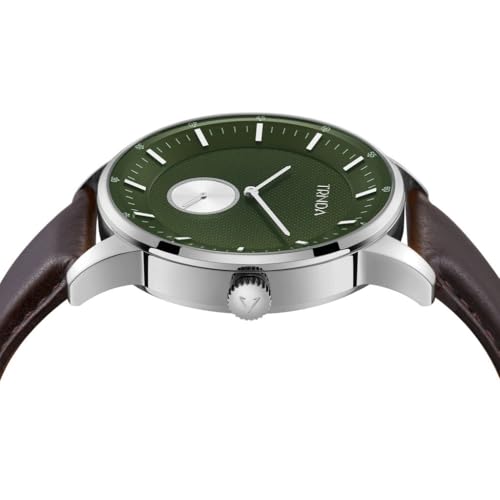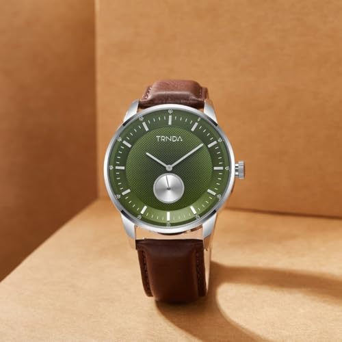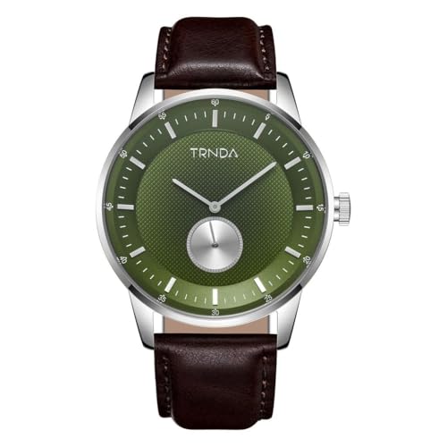 TRNDA - ساعة ستانلس ستيل للرجال من ترندا - مينا اخضر بنمط الاعشاب البحرية وسوار جلدي بني