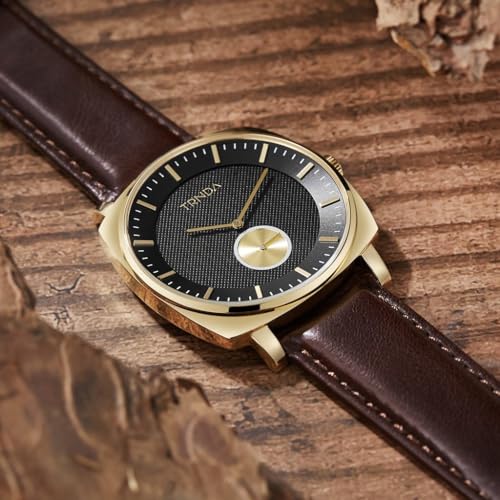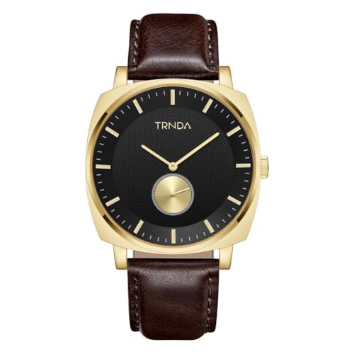 TRNDA - ساعة مربعة ذهبية من الستانلس ستيل للرجال من ترندا - مينا اسود لا يتأثر بمرور الزمن مع سوار جلدي بني