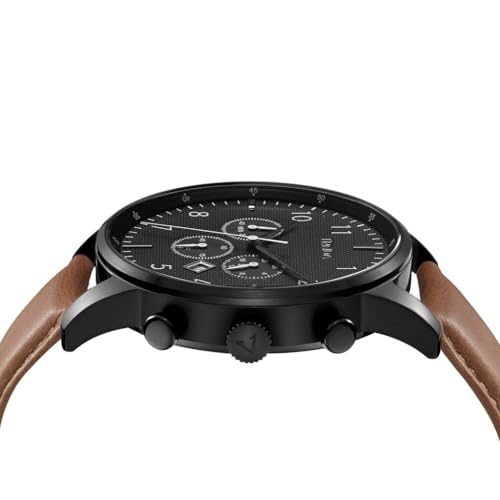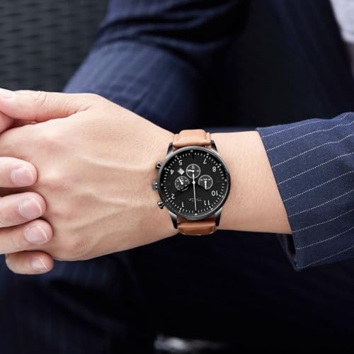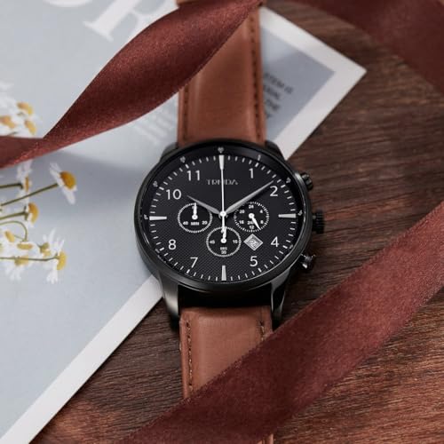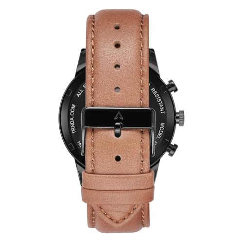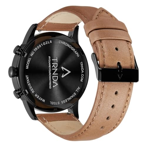 TRNDA - ساعة من الفولاذ المقاوم للصدأ للرجال من ترندا، مينا أسود رصاصي وسوار جلد بلون بيج داكن