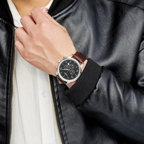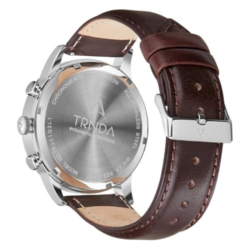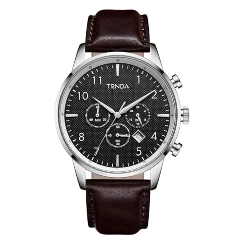 TRNDA - ساعة من فولاذ مقاوم للصدأ بمينا أسود ورصاصي وسوار جلد بني للرجال من ترندا