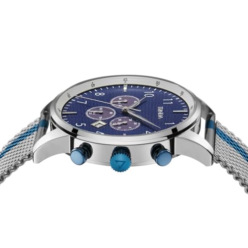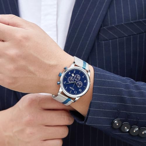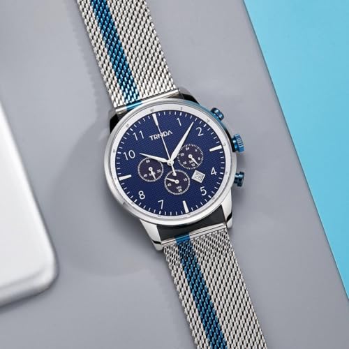 TRNDA - ساعة أنيقة من الفولاذ المقاوم للصدأ للرجال من ترندا - مينا بلون أزرق أنيق وسوار بتصميم شبكي ولون فضي