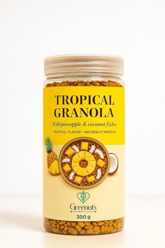 Greenuts - تروبيكال جرانولا مقرمشة بنكهة الفواكه مع رقائق الشوفان المحمص والأناناس المجفف وجوز الهند - طبيعية وخالية من الجلوتين وبدون إضافات ووجبة خفيفة نظيفة غنية بالألياف من جرينتس، 300 جم