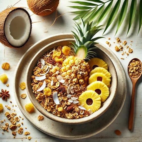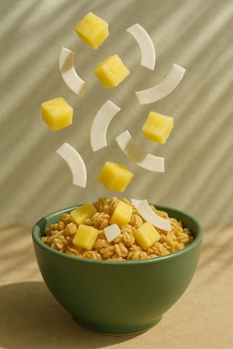 - (نكهة استوائية في كل ملعقة) جرانولا لذيذة غنية بالنكهات الصيفية والمكونات الطبيعية التي تجسد طعم الصيف، مصممة لتجعل وجباتك الخفيفة الصحية أكثر متعة وإشباعًا.