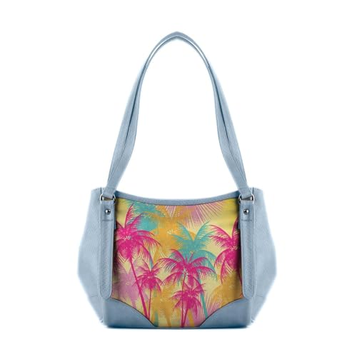 Generic - شنطة يد كبيرة توت من الجلد بطبعة نخيل استوائية، قماش ازرق بتصميم متعدد الالوان