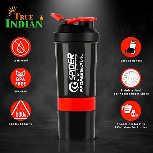 TRUE INDIAN - زجاجة شيكر للبروتين والمياه من ترو انديان مناسبة لصالة الالعاب الرياضية ولخليط البروتين مع كرة خلط الستانلس ستيل- سعة 500 مل احمر بلاستيك