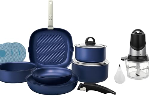 Trueval - تروفال طقم أواني طهي غير لاصق مكون من 15 قطعه-بمقبضين قابلين للازاله -باللون الأزرق الملكي -أغطيه من الاستانلس ستيل -3 قواعد مجانيه-+مفرمه لحم من تاتش هديه مجانيه
