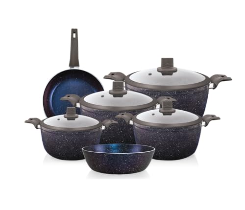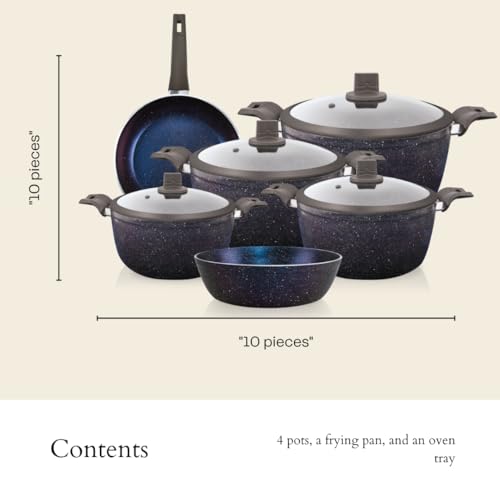 Trueval - طقم أواني الطبخ من تروفال، مصنوع من الجرانيت باللون الأزرق، آمن للفرن مع طلاء جرانيت، يتكون من 10 قطع