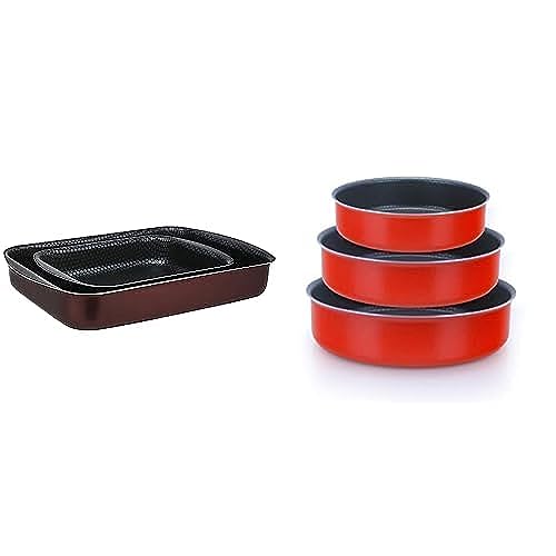 Trueval - طقم كسرولات مستطيلة من تروفال، قطعتان (مقاس 25-35)، لون أحمر غامق + طقم صواني فرن من تروفال، مكون من 3 قطع بمقاسات عملية 24-26-30، أحمر