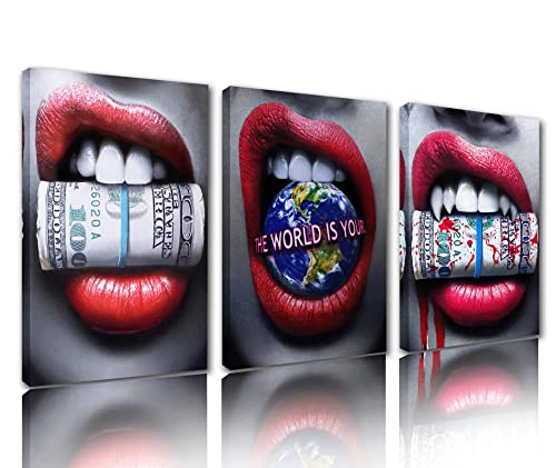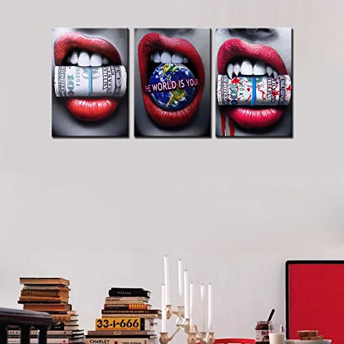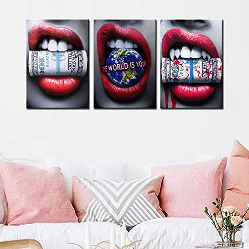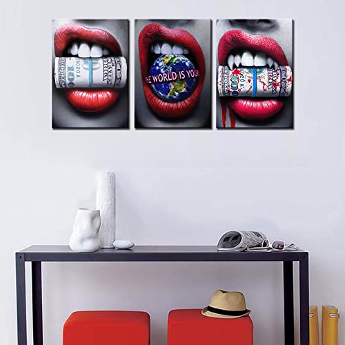 Tucocoo - توكوكو لوحات فنية لغرفة المعيشة بتصميم شفاه حمراء مع صورة مقربة بالدولار 3 قماشية عصرية للمرأة فن جداري فني معاصر ديكور منزلي جيكلي باطار خشبي جاهز للتعليق 42 × 20 انش