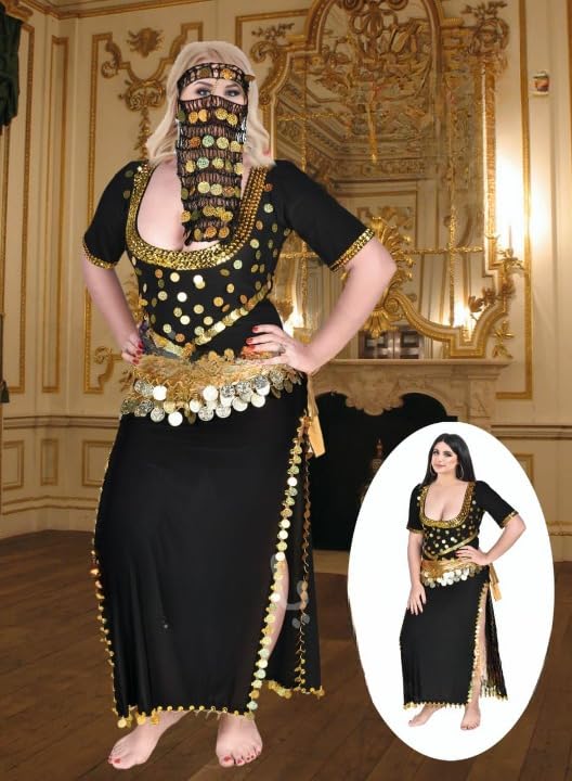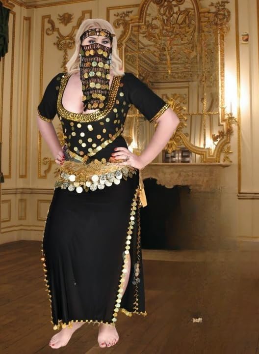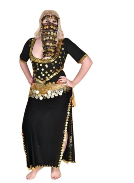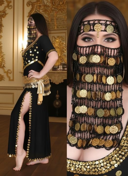Generic - جلابية رقص شرقي تل مطرزة بالعملات والترتر الذهبي – ملابس رقص شعبي بفتحة جانبية + برقع وجه وحزام خصر 3 قطع – طقم رقص نسائي 3 قطع Free Size