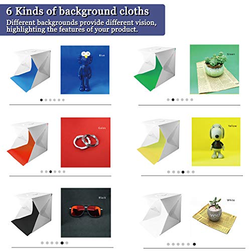 - 🎬【خلفيات متعددة الألوان】يأتي صندوق الإضاءة المصغر هذا مع 6 خلفيات قابلة للإزالة (أسود، أبيض، أخضر، أصفر، أزرق وأحمر) من مادة ايفا، مما يتيح لك تغيير لون الخلفية بسهولة وتحقيق تأثيرات تصوير متنوعة.