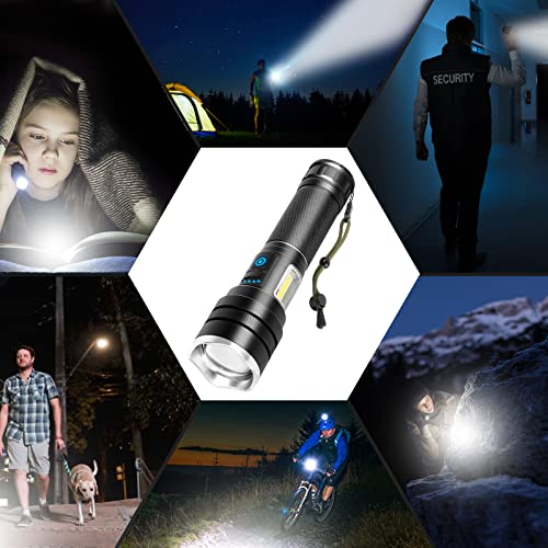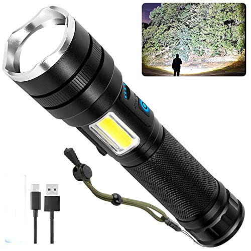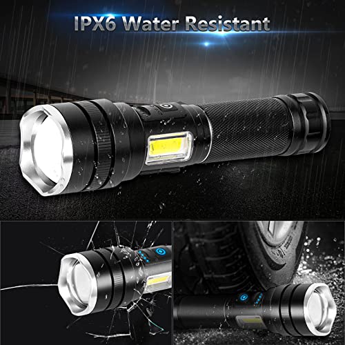 TUNFOU - مصباح يدوي LED عالي السطوع قابل لاعادة الشحن بـ6 اوضاع مع ضوء عمل سي او بي قابل للتكبير ومضاد للماء للتخييم والطوارئ (اسود)