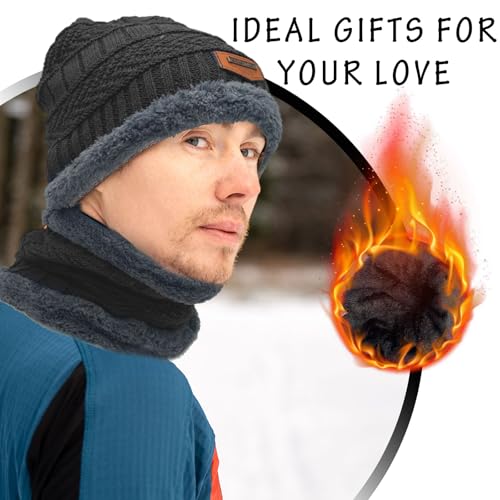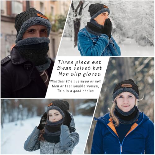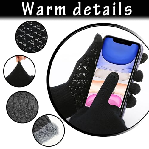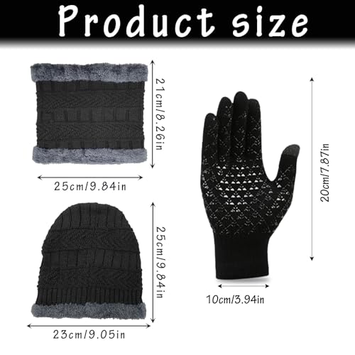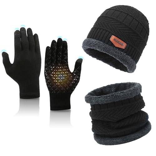 TUONYIS - مجموعة قفازات وقبعة ووشاح شتوية 3 في 1 من تونيس، قبعة محبوكة دافئة تعمل باللمس وتدفئة الرقبة، قبعة صغيرة شتوية دافئة مع بطانة من الصوف الناعم ووشاح خارجي وقفازات مضادة للانزلاق للنساء والرجال (اسود)
