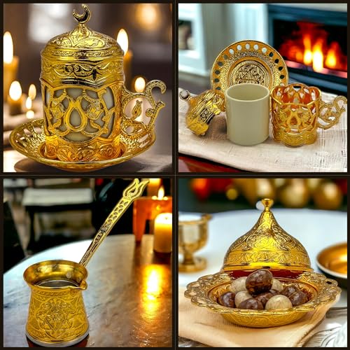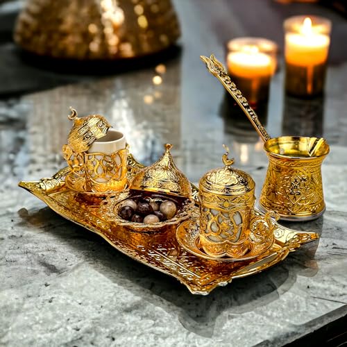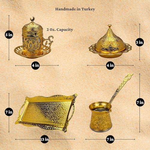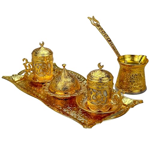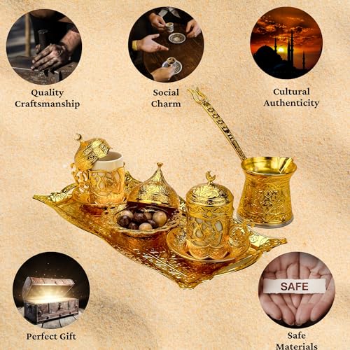 1453 Imports - طقم فناجين لشخصين مع ماكينة تحضير القهوة التركية، يتضمن فناجين وأطباق فناجين وسكرية وكنكة قهوة، ذهبي