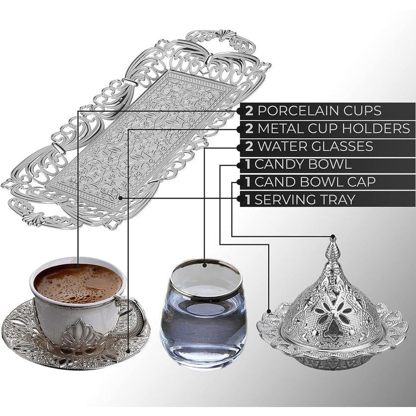 Generic - طقم تقديم القهوة التركية، فضي، صينية معدنية مزخرفة، 2 كوب بورسلين، 2 حامل اكواب معدني، 2 كوب ماء، وعاء حلوى مع غطاء، 9 قطع