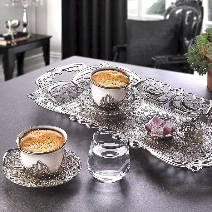 - طراز تركي أصلي: مصمم خصيصًا لتقديم القهوة التركية بالطريقة التقليدية، مع حوامل أكواب معدنية (زارف) تحمي اليدين من الأكواب الساخنة وأكواب الماء لتنظيف الحنك
