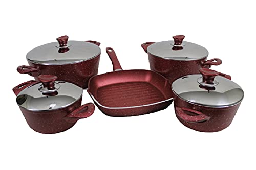 Simlon - طقم اواني طهي جرانيت تركي 9 قطع يشمل صينية شواء من الجرانيت الاحمر المضلع مصقول سيملون
