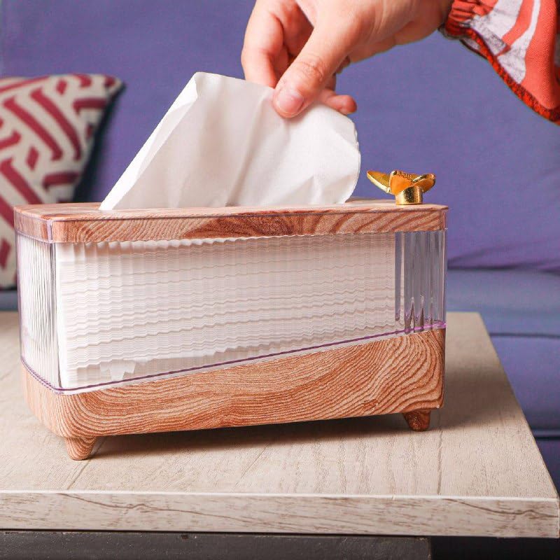 - رؤية واضحة وحماية فائقة: بفضل جوانب الأكريليك الشفافة، يمكنكِ معرفة مستوى المناديل بسهولة، بينما يوفر الهيكل الخشبي حماية ممتازة للمناديل من العوامل الخارجية ببراعة.