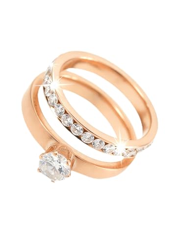 Generic - خاتم من قطعتين مرصع بالزركون المكعب والكريستال من الستانلس ستيل مطلي بالذهب عيار 18 قيراط للنساء - مقاس 17