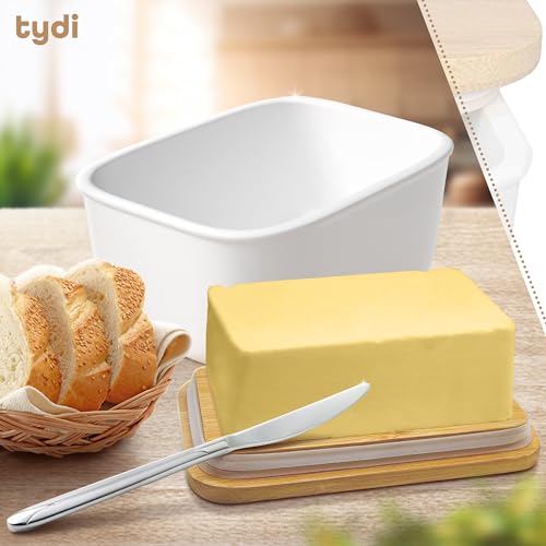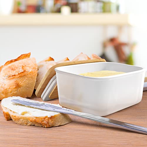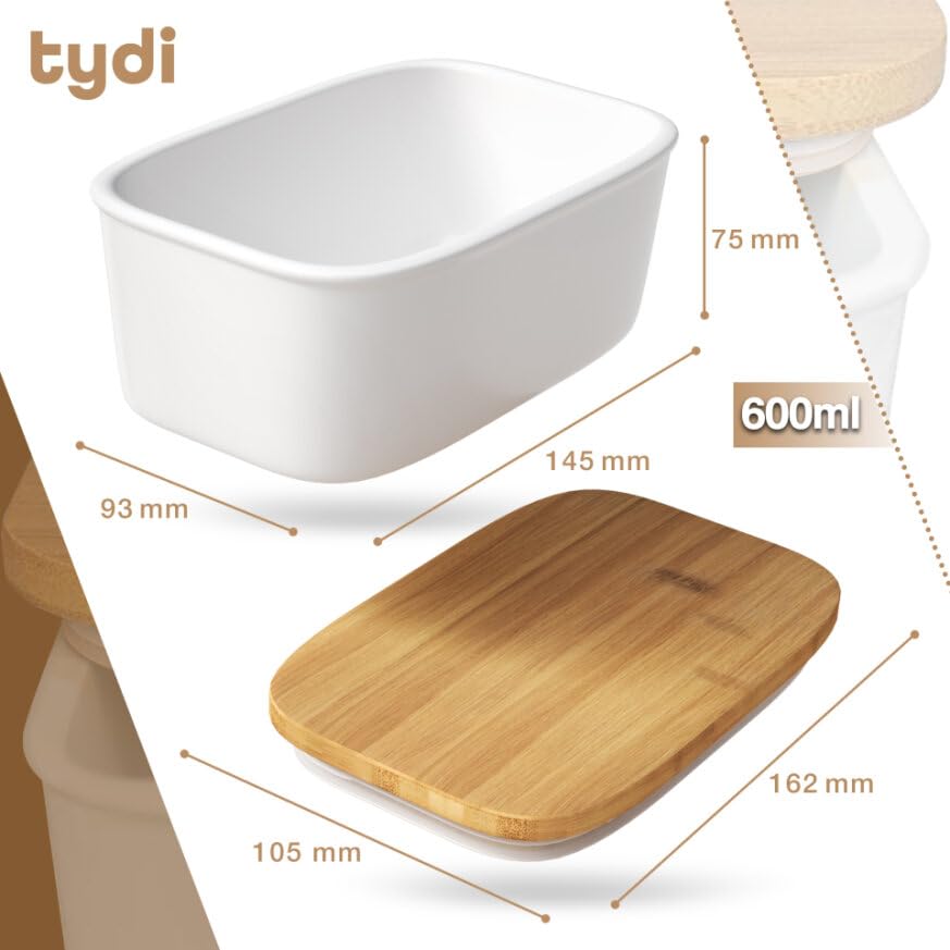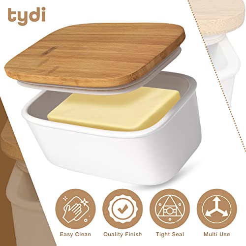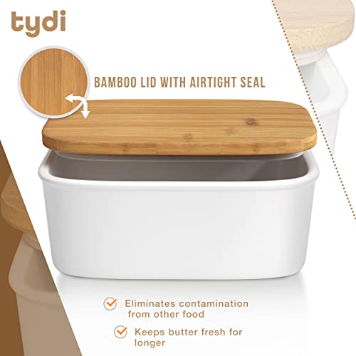 Tydi - طبق زبدة بورسلين أنيق مع غطاء سيراميك- سدادة سيليكون قابلة للإزالة - أبيض مع غطاء البامبو- 16 × 10.5 × 7 سم، من تايدي
