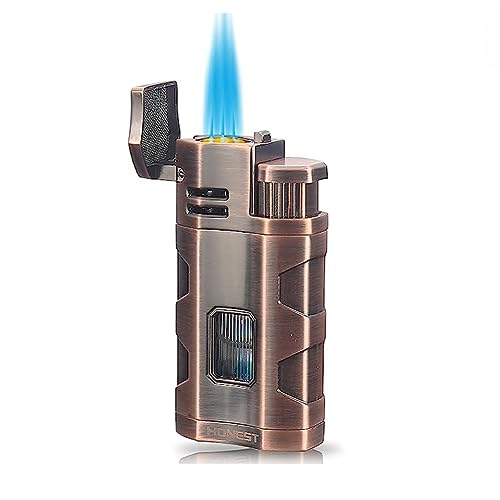 TYEdEE - ولاعة شعلة مقاومة للرياح وثلاثية اللهب وقابلة لإعادة الملء بغاز البوتان مع حامل وفتاحة سجائر من تايدي (غاز البوتان غير متضمن، لون نحاسي)
