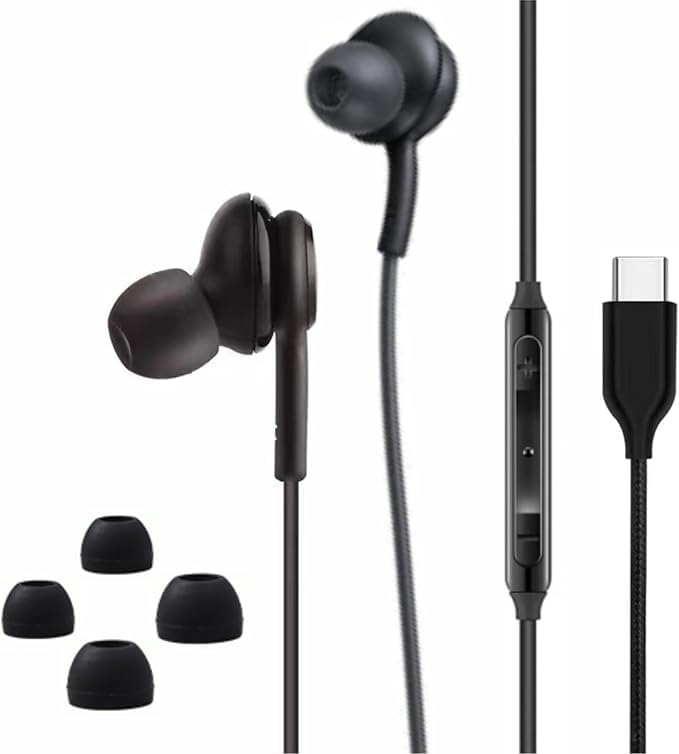 Generic - سماعات للأذن نوع سي تصميم اي كيه جي بطبقة نايلون لمزيد من الحماية متوافقة مع موبايلات سامسونغ وأوبو وآيفون 15 وS21 ونوت وA52s وS22 و زد فليب 3 وشاومي مي 11 الترا ونوت 11 برو ستيريو عالي النقاء - اسود