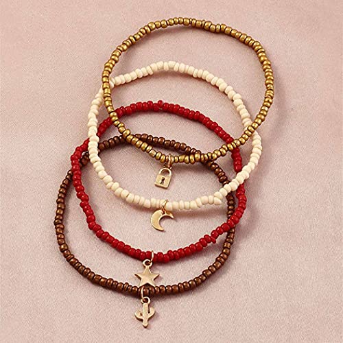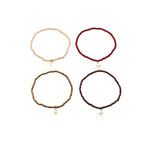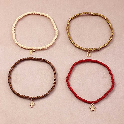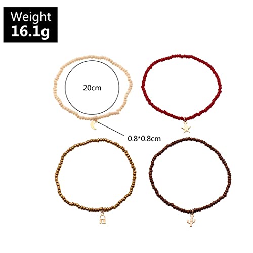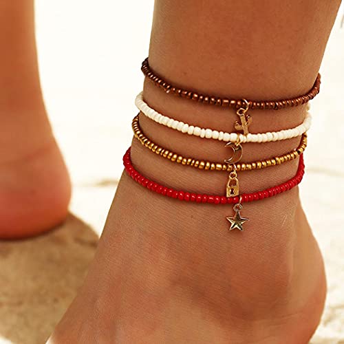 U/D - خلخال متعدد الطبقات مصنوع يدويا من خرز بوهو حريمي ملون بدلاية على شكل قمر ونجوم مزين بخرز مجوهرات قدم مرنة للصيف والشاطئ 4 قطع A